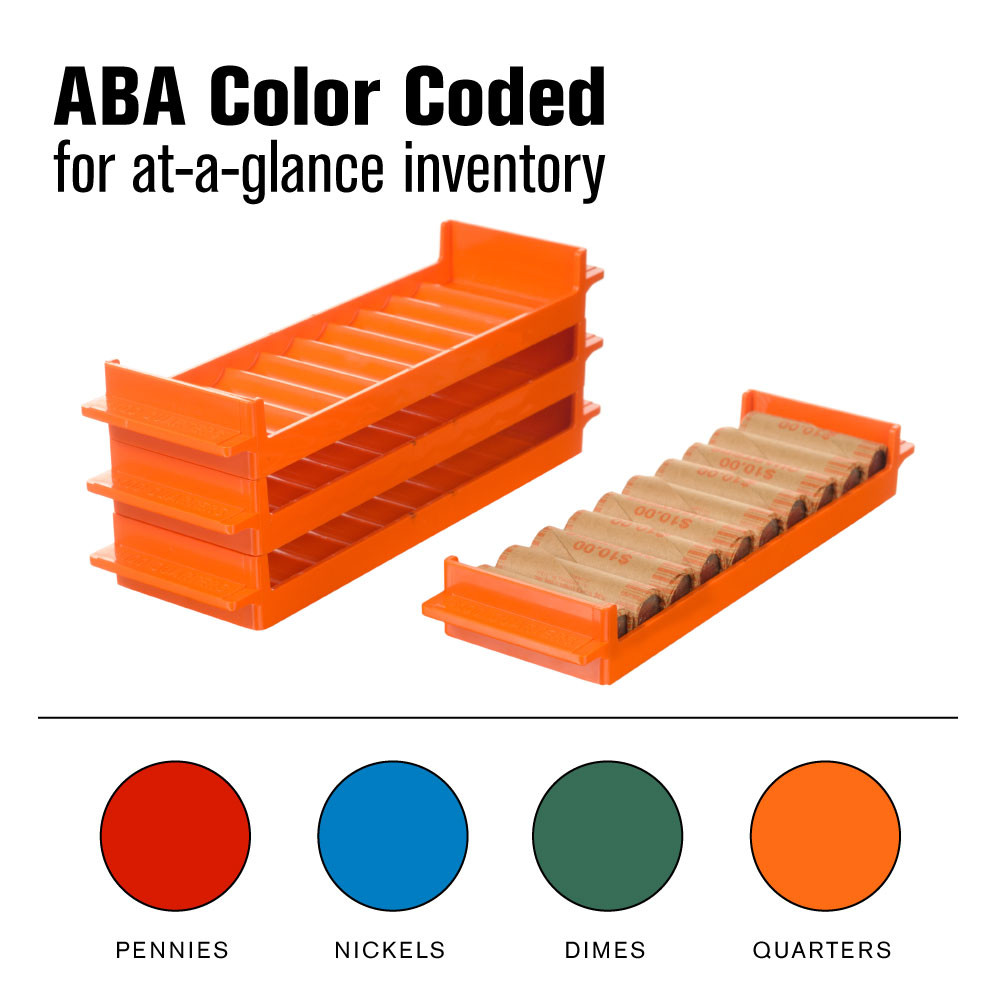 Featuring denomination and capacity markings on both ends, our coin trays ensure quick inventory recognition, saving you valuable time during counting and sorting tasks. The color-coded design conforms with ABA and Federal Reserve standards, facilitating seamless integration into your existing coin handling processes.