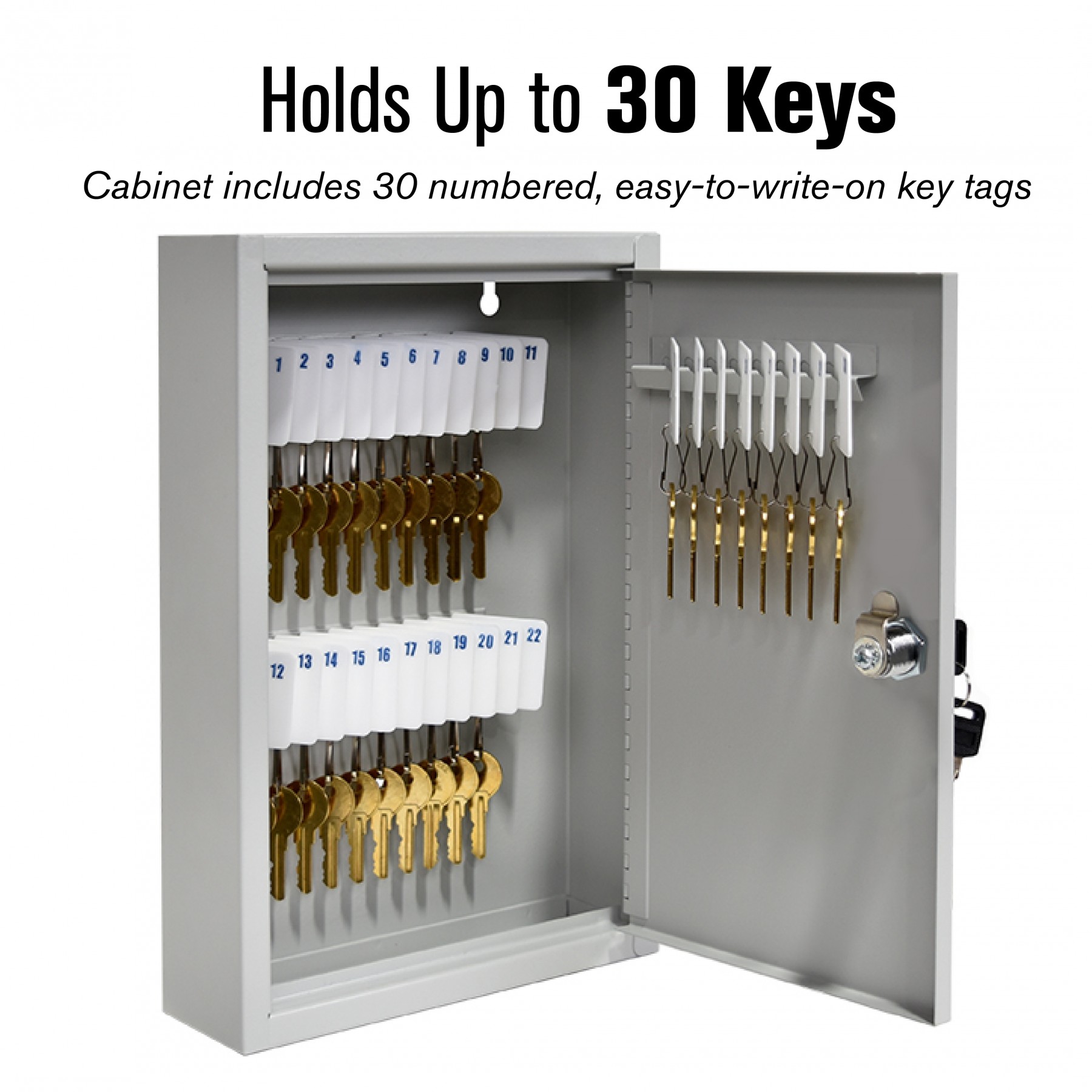 - 30 Key Capacity - Cabinet includes 30 easy-to-write-on key tags - Numbered 1-30.